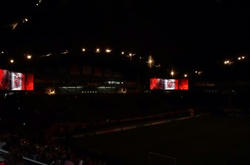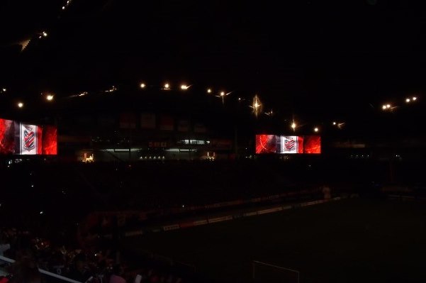 試合前に照明が落ちて、2個になった大型ビジョンも映えるね~