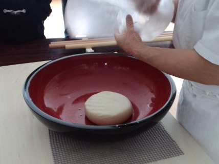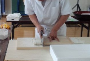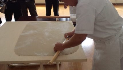 11時から生徒たちの見守る中、先生の蕎麦打ち実演が始まります!