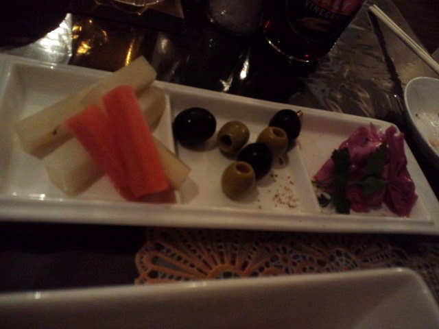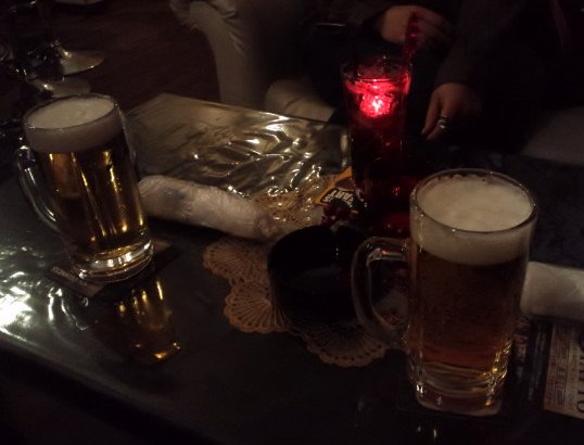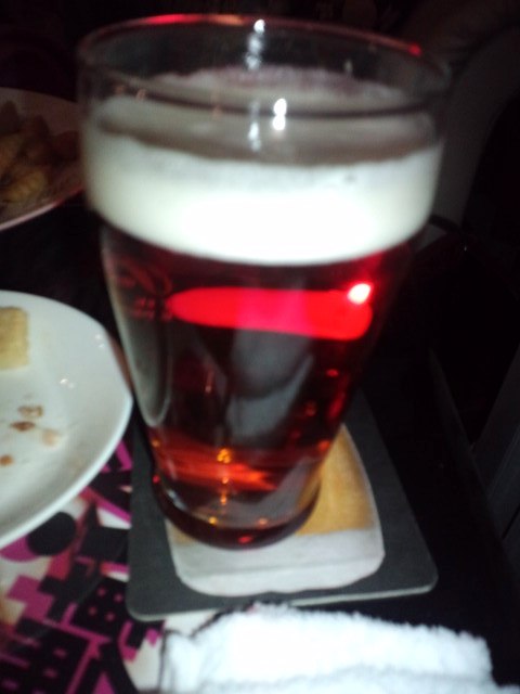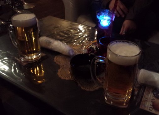 …で、やってきたのは「おやじビール」と、「乙女カクテル」(チンザノカシス)。