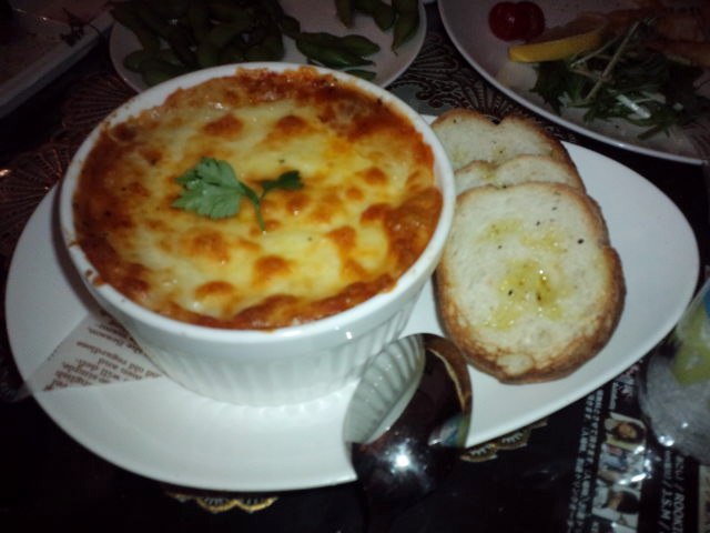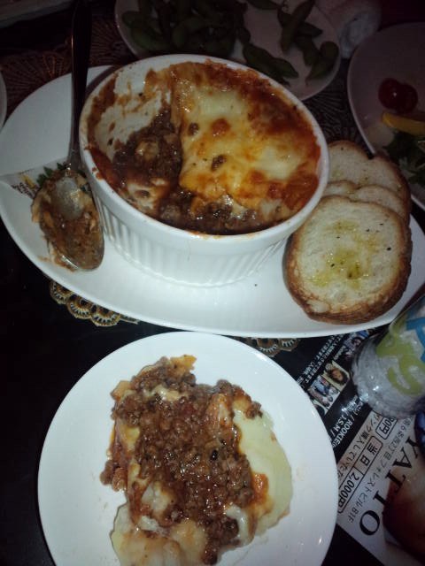 お肉感たっぷりのミートソースの上に、マッシュポテトをのせて焼いた