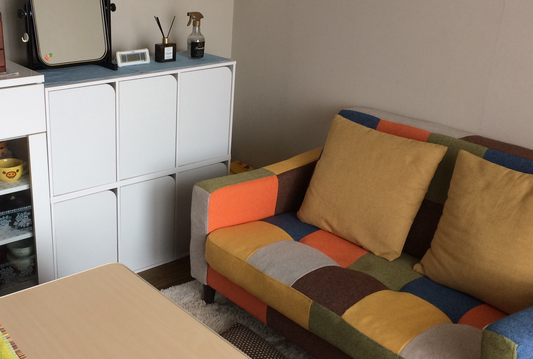 白い扉付きのカラーボックスは、お手頃価格でなかなかいい感じ♪