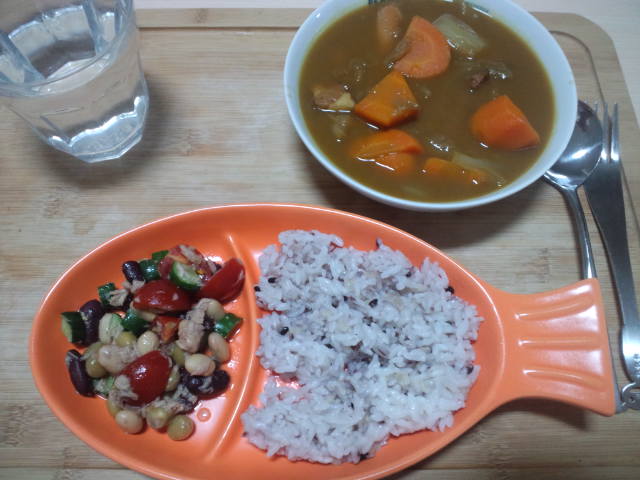お皿を変えて雰囲気が違うけど、サラダは前日と一緒ですよ。