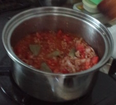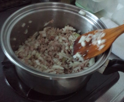 オリーブオイルで豚ひき肉と玉ねぎを、しっかり炒めていきます。