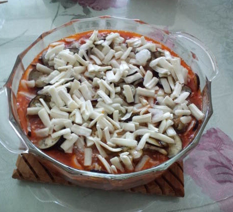 ミートソース+茄子+ミートソース+茄子+チーズと重ねていき、オーブンで