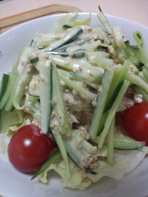 めんつゆとお酢とマヨネーズを適当にまぜて、ゴマをたっぷり