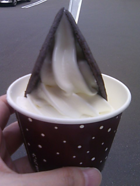 カップに入ったソフトクリームに、六花亭のお菓子「雪やこんこ」の