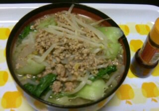 『チンゲン菜と肉味噌のもやしたっぷりスープ』です!